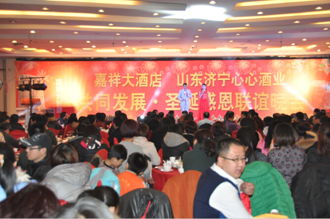 12月24日,平安夜,心心酒業與嘉祥大酒店聯合舉辦的“共同發展圣誕感恩聯誼會”在嘉祥大酒店隆重舉行。大酒店內張燈結彩,火樹銀花,高朋滿座,喜氣洋洋,一派節日的氣氛。公司董事長韓宇、嘉祥大酒店總經理楊總、嘉祥縣企事業單位、心酒經銷商等近400余位嘉賓參加了聯誼會。